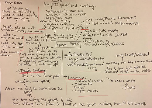 After collecting the results, it was easy for me and my teammates to carry the further procedure. Keeping the audiences interests and ideas in mind, I researched for days to get an interesting idea for our music video. I browsed different genres looking their codes and conventions, watched several music videos not only american/british but also Indian and Pakistani to create my product differently. However, after a lot of hard work i created a story and made a mind map given below.